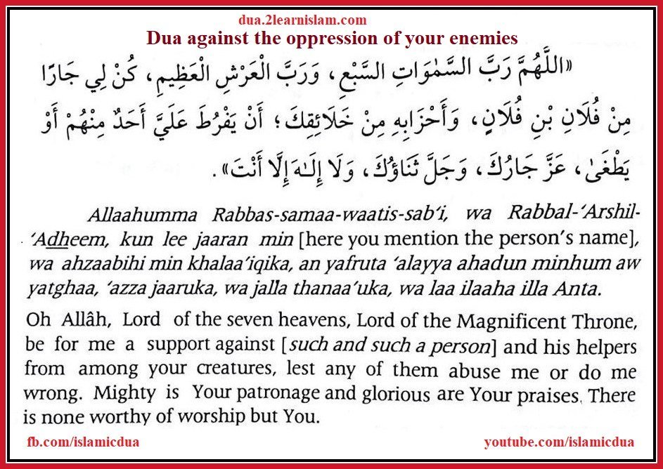 أللَّهُمَّ رَبَّ السَّمواتِ السَّبْعِ وَرَبَّ الْعَرْشِ الْعَظِيْمِ, كُنْ لِي جاَراً مِنْ (فُلانِ بْنِ فُلاَنٍ),وَأَحْزَابِهِ مِنْ خَلاَئِقِكَ أَنْ يَفْرُطَ عَلَيَّ أحَدٌ مِنْهُمْ أَوْ يَطْغَى, عَزَّ جاَرُكَ وَجَلَّ ثَناَؤُكَ, وَ لاَ إِلَهَ إلاَّ أَنْتَ