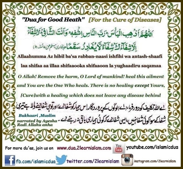 “O Allah! Remove the harm, O Lord of mankind! heal this ailment and You are the One Who heals. There is no healing except Yours, [Cure]with a healing which does not leave any disease behind”